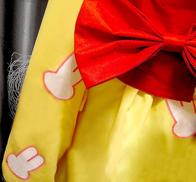 袖口はパフ袖のデザイン、ふわふわで可愛い、白レースの襟と赤色の蝶結びのネクタイはとっても優雅!